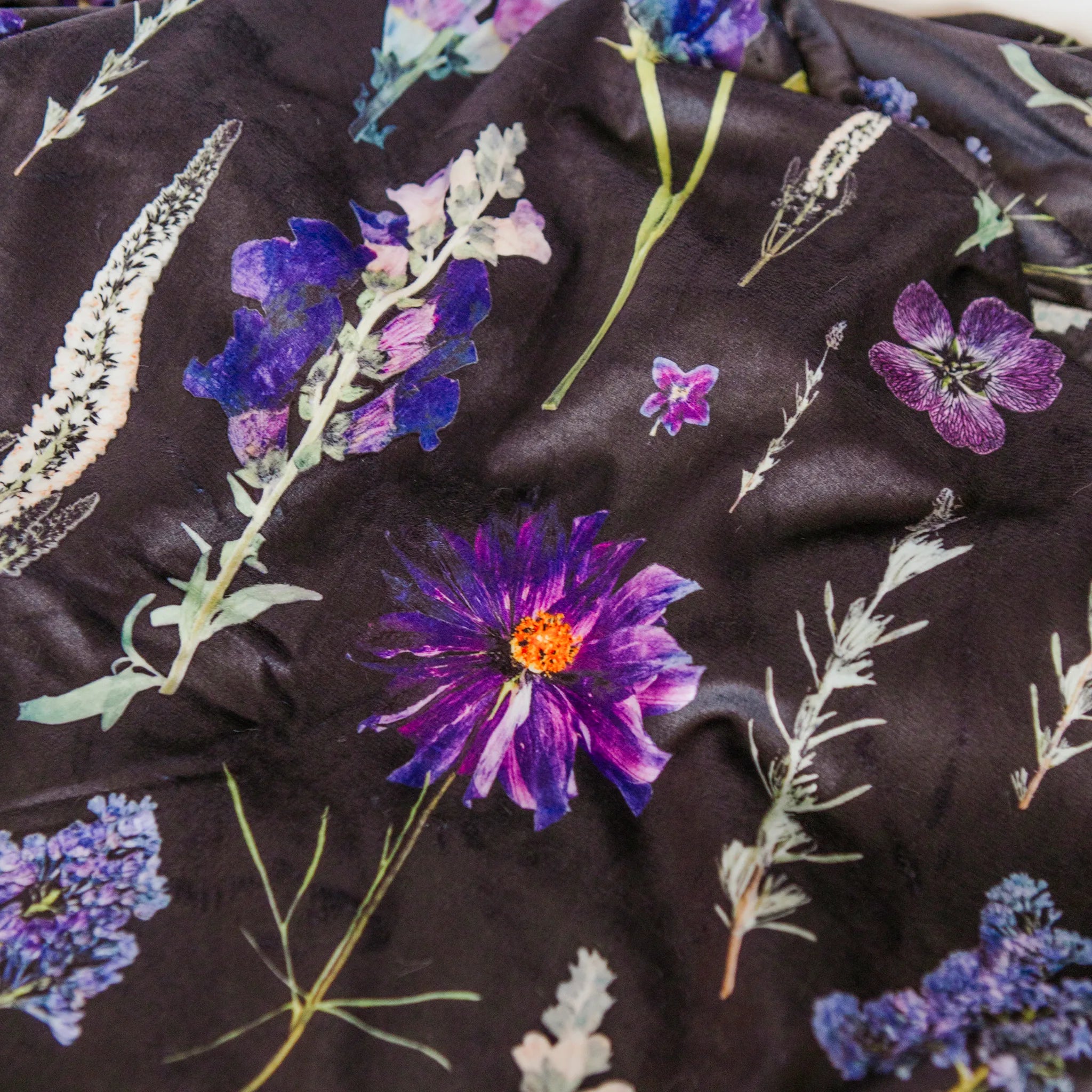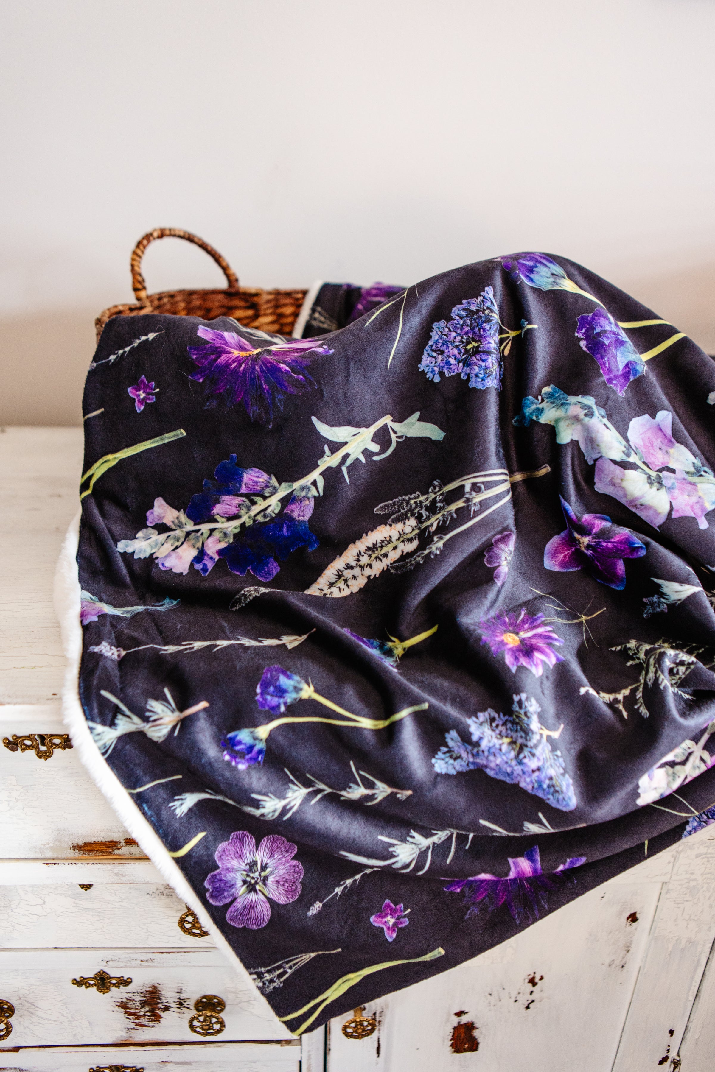 This ultra-soft throw blanket is all about the moody floral feels, featuring pressed snapdragons, lavender, and veronica in deep purples and violets. The front shows off the dramatic floral print, while the back is lined with a plush cream-coloured minky for maximum coziness. Warm, inviting, and made for slow mornings and fireside nights, it brings a touch of dark floral charm to any space.