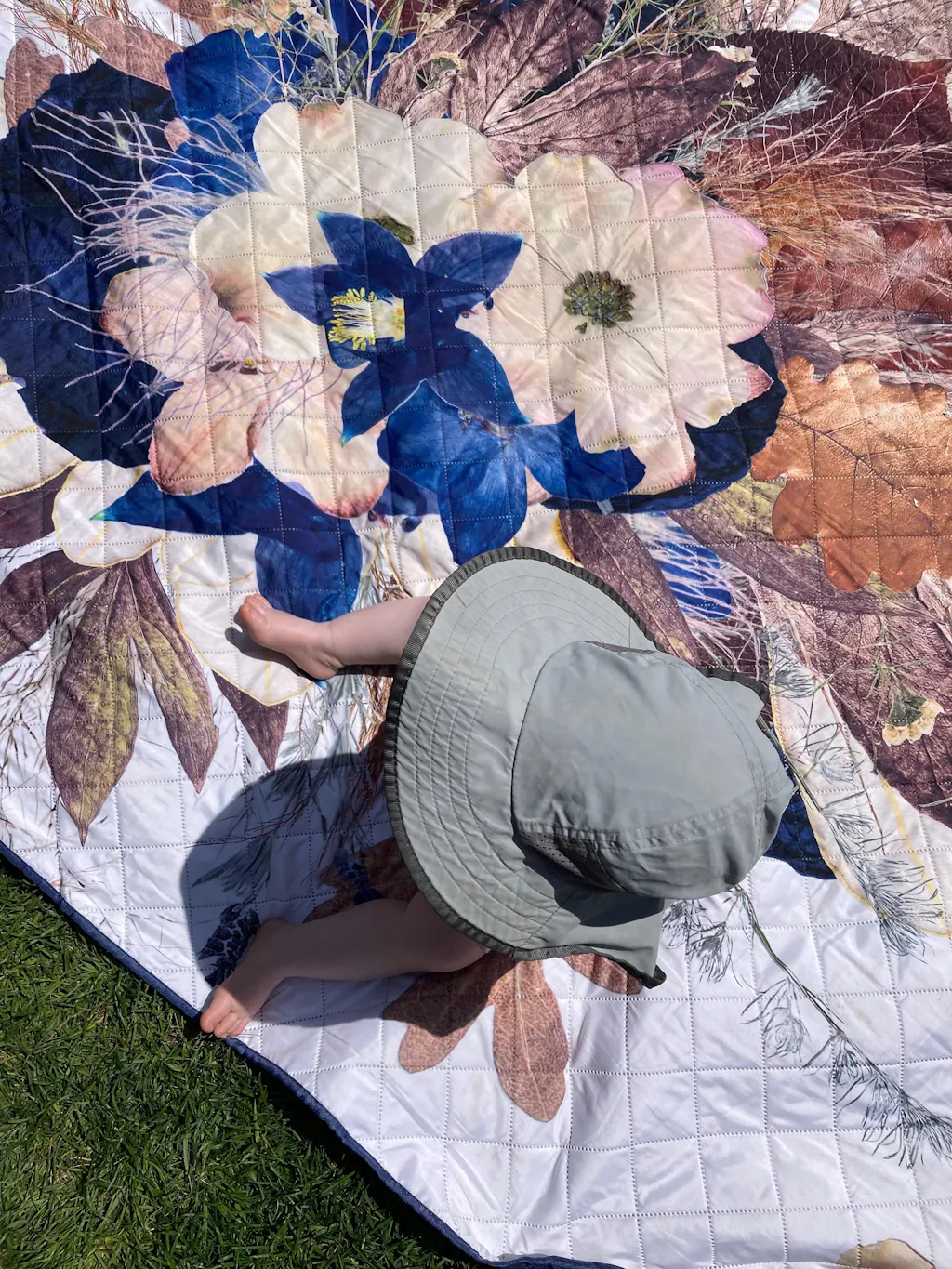 This lightweight, water-resistant outdoor blanket features rich florals made from real pressed flowers grown, preserved and digitized in Canada. With warm browns, soft dusty pinks, and deep indigo accents, it brings golden hour vibes and the quiet romance of wheat fields in the breeze.