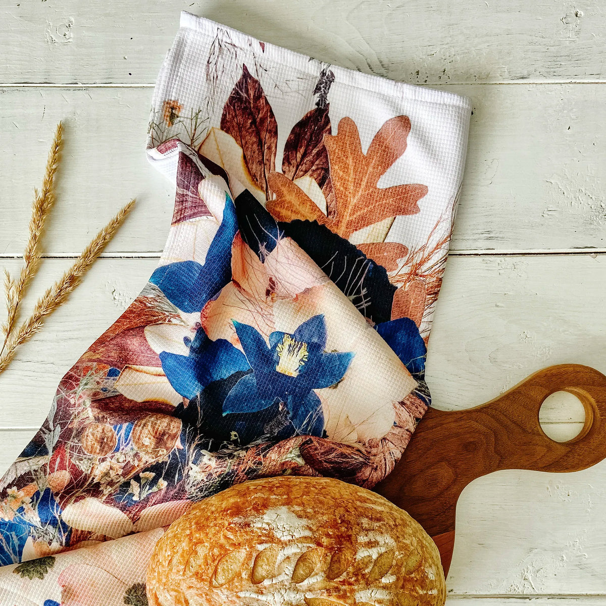 With a warm, bright, fall-inspired floral design made from real pressed flowers in amber, cream, and deep rust, our Lily & Ember tea towel gives off cozy autumn vibes... or showgirl vibes... IYKYK ;)